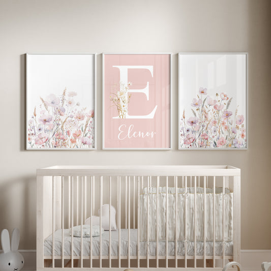 Girls Baby Name Initial Wildflower Print | Set of 3
