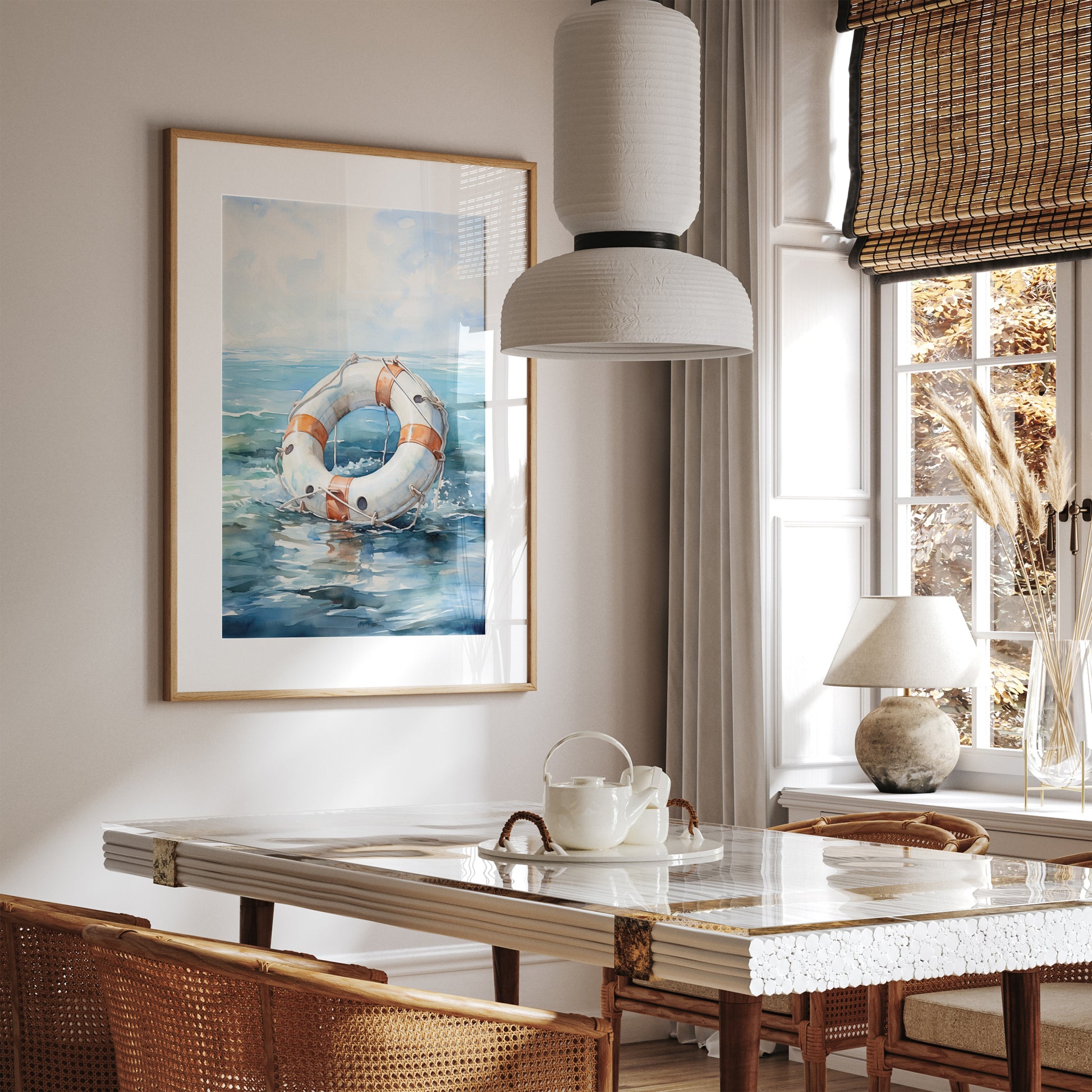 Add a coastal charm to your bathroom décor or beach house themed rooms with this life buoy on water print. The blue tones and waves capture a sense of sea life and calmness.