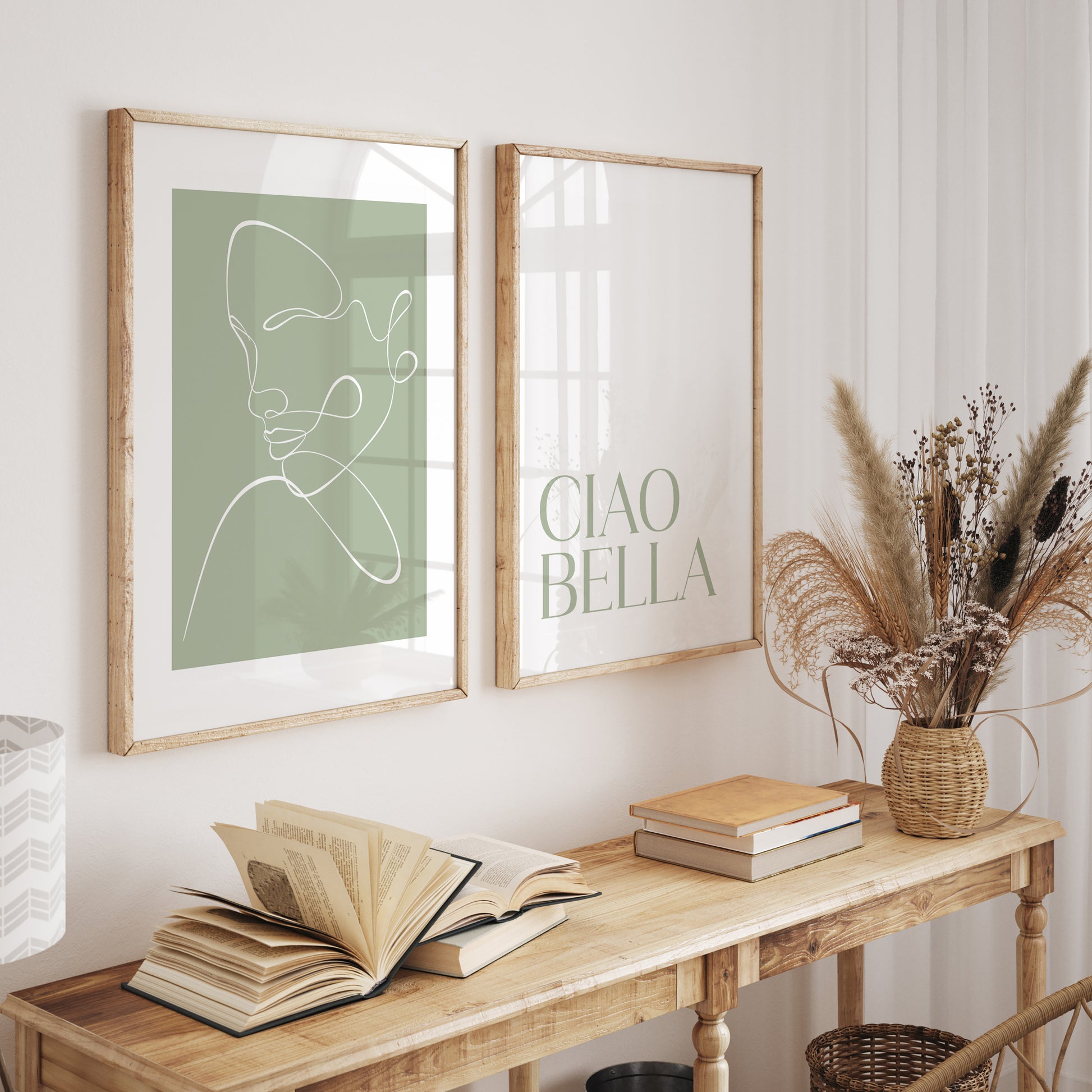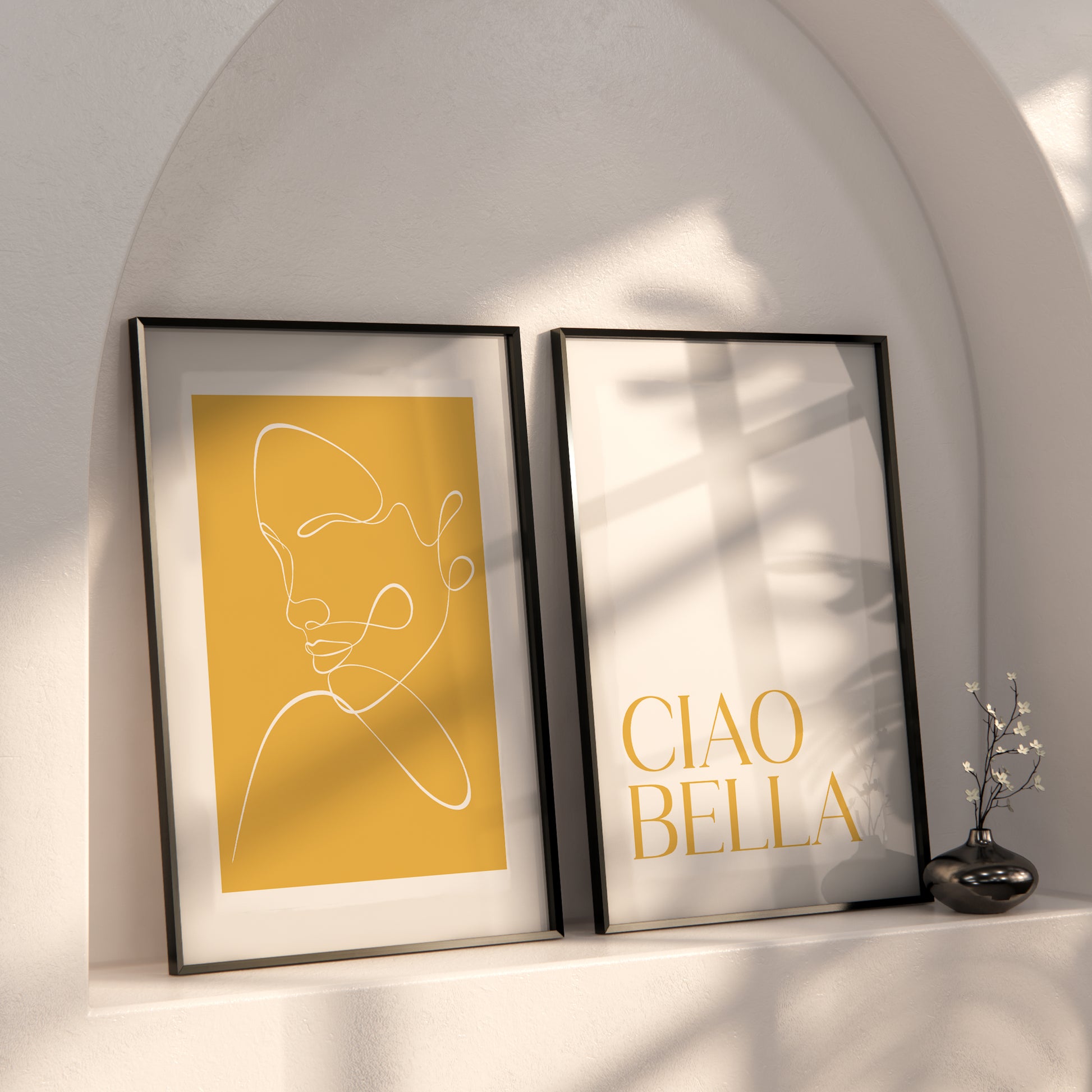 A beautiful print for your bedroom featuring a set of two prints with an elegant line drawing of a woman and the quote 'Ciao Bella'. This 2 piece bedroom print set would look great framed above a bed, in your make up room or salon.
