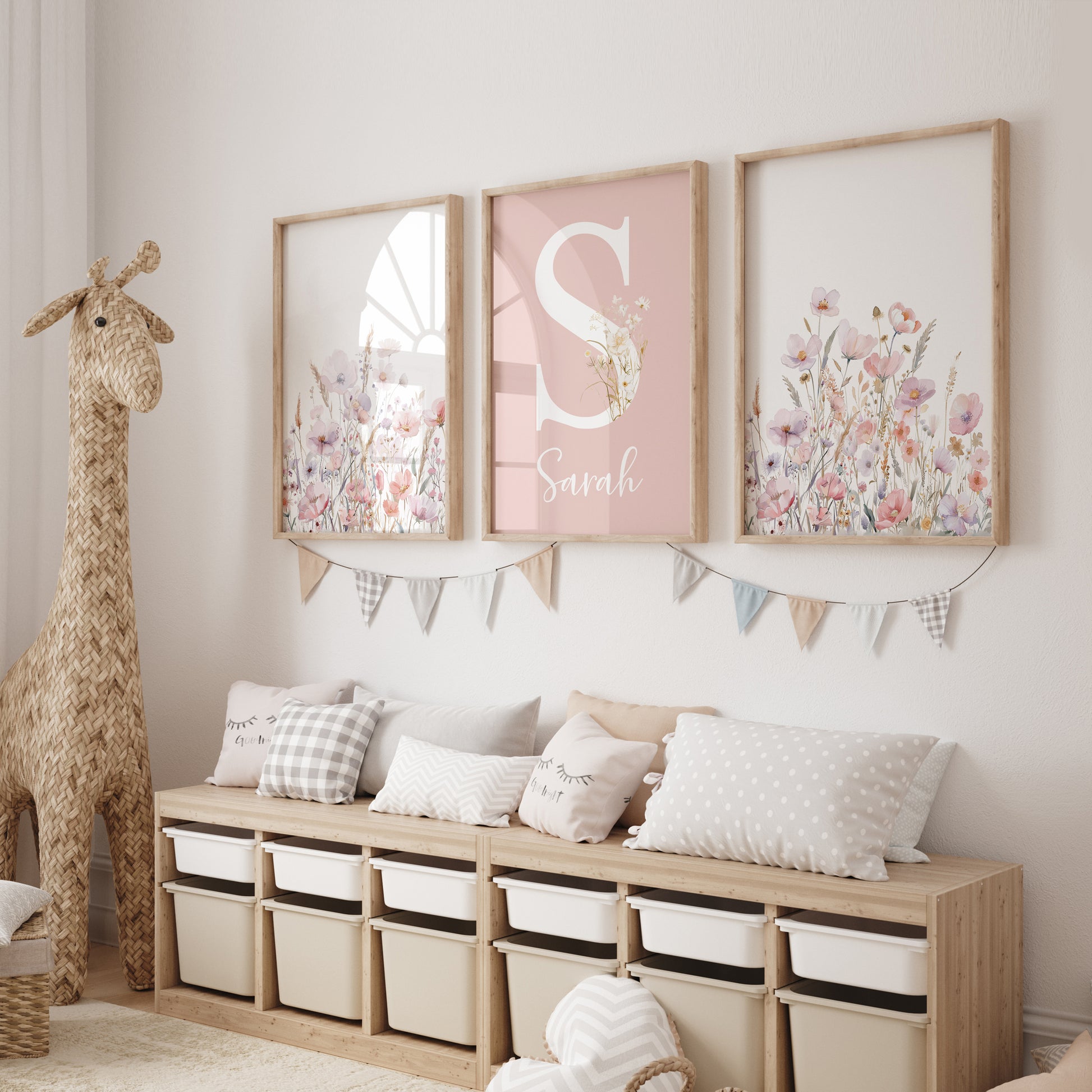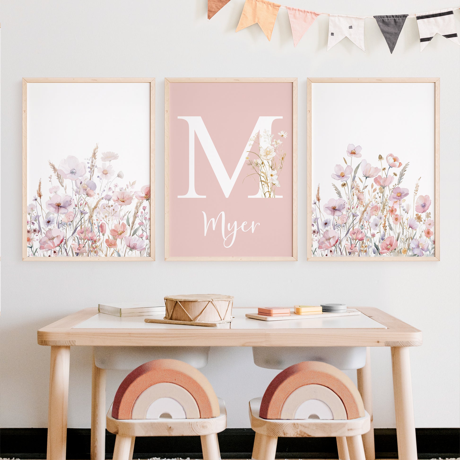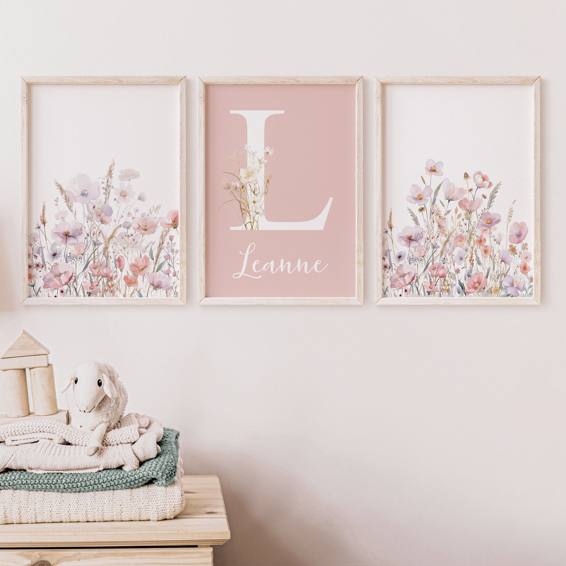 Girls Baby Name Initial Wildflower Print | Set of 3
