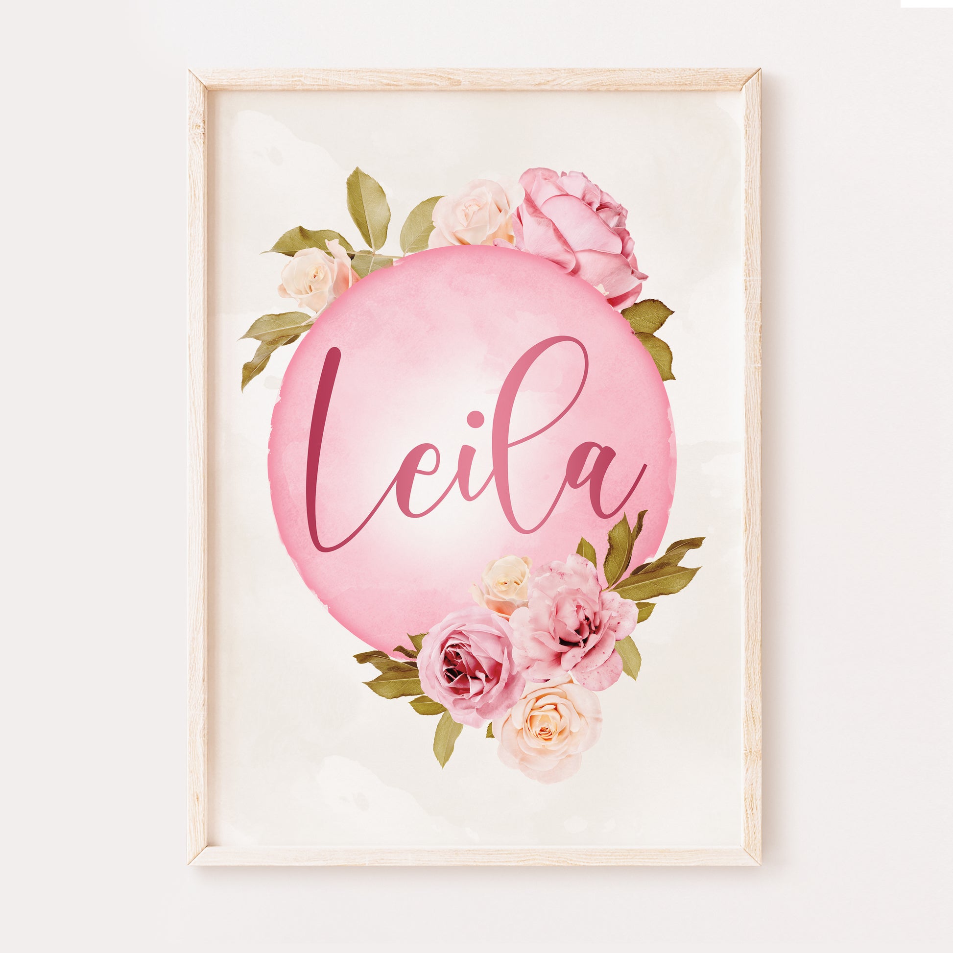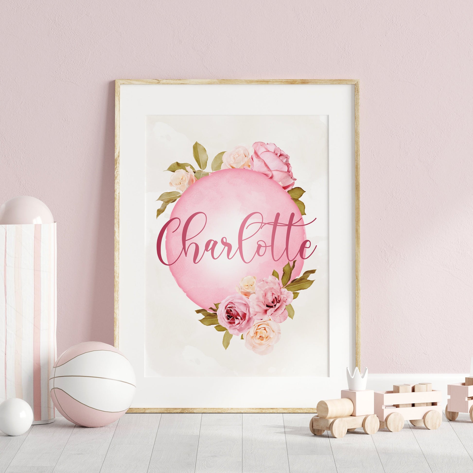 A beautiful pink personalised girls nursery print illustrating your child's name written in an elegant font set on a pink background covered in a rose floral design.