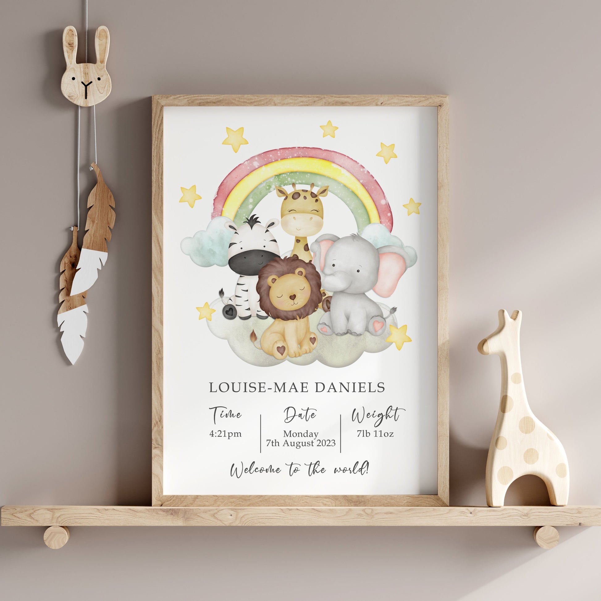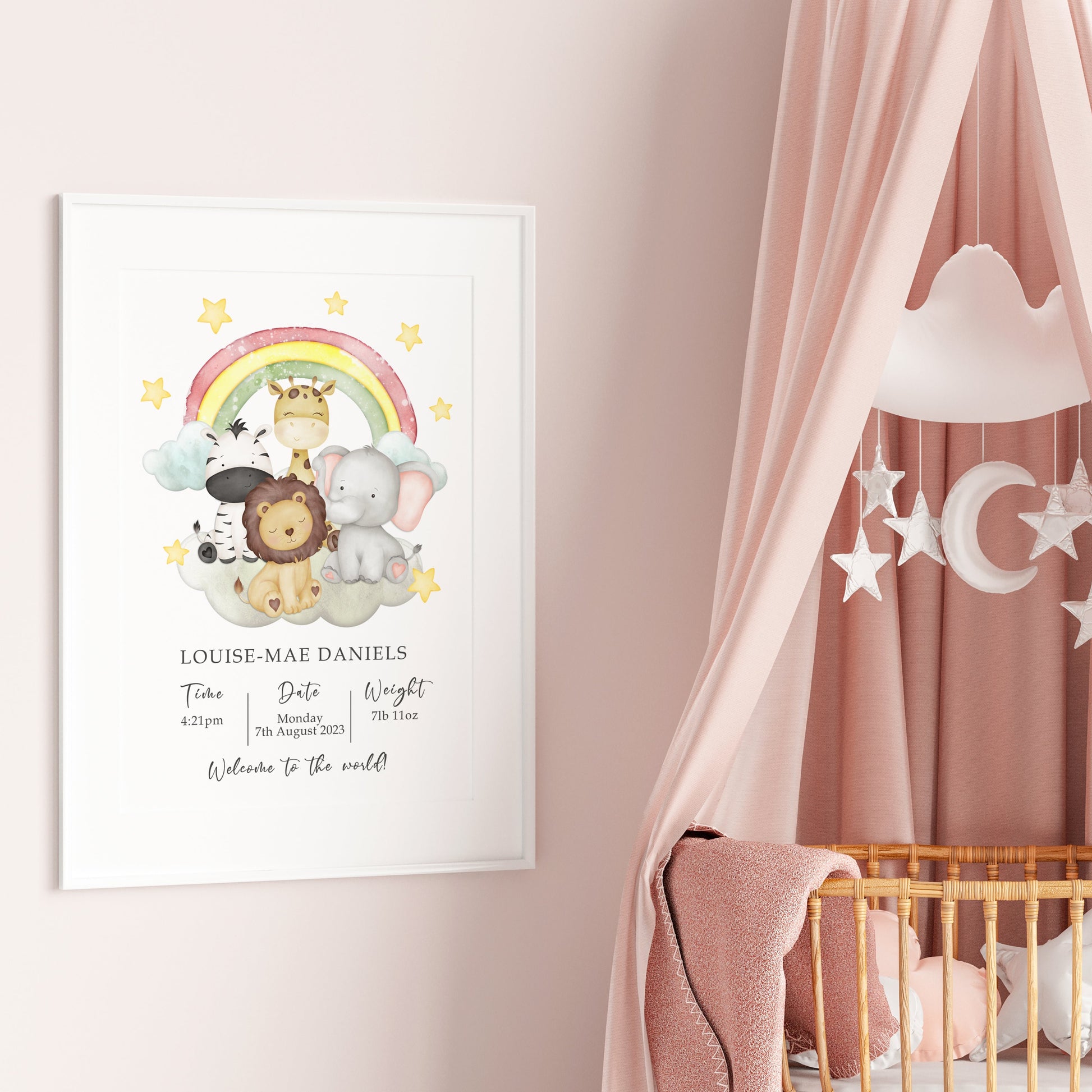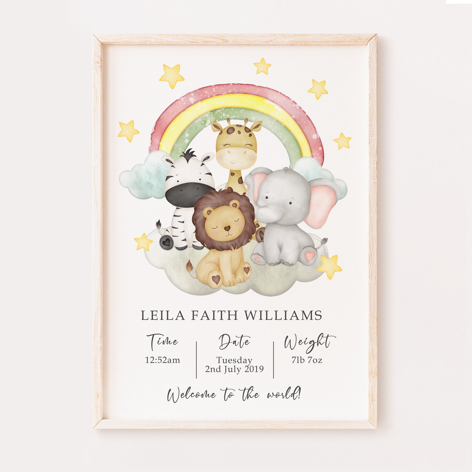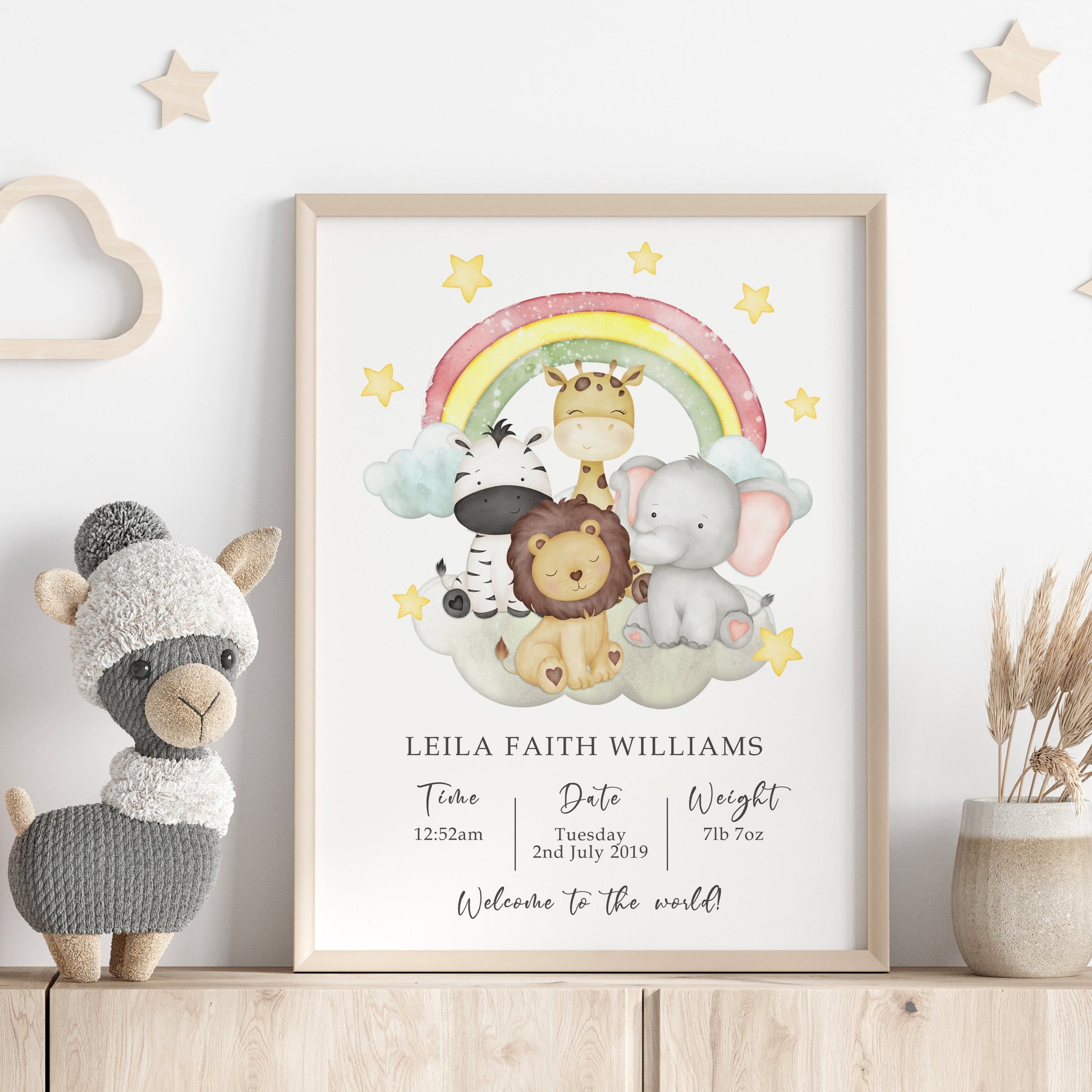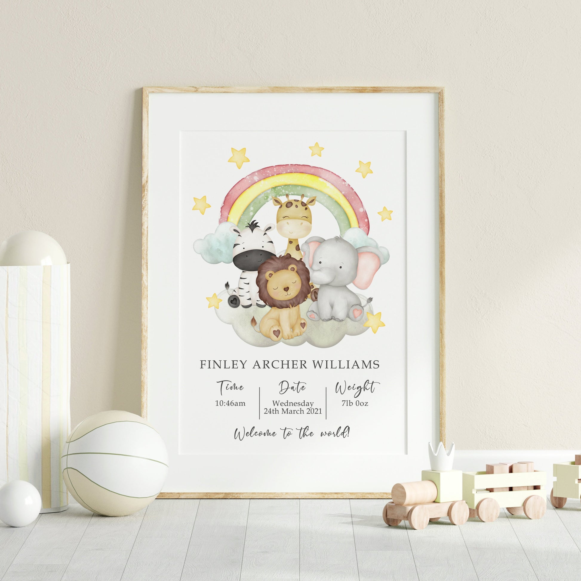 A personalised baby birth announcement print illustrating safari animal friends sitting underneath a beautiful rainbow.
