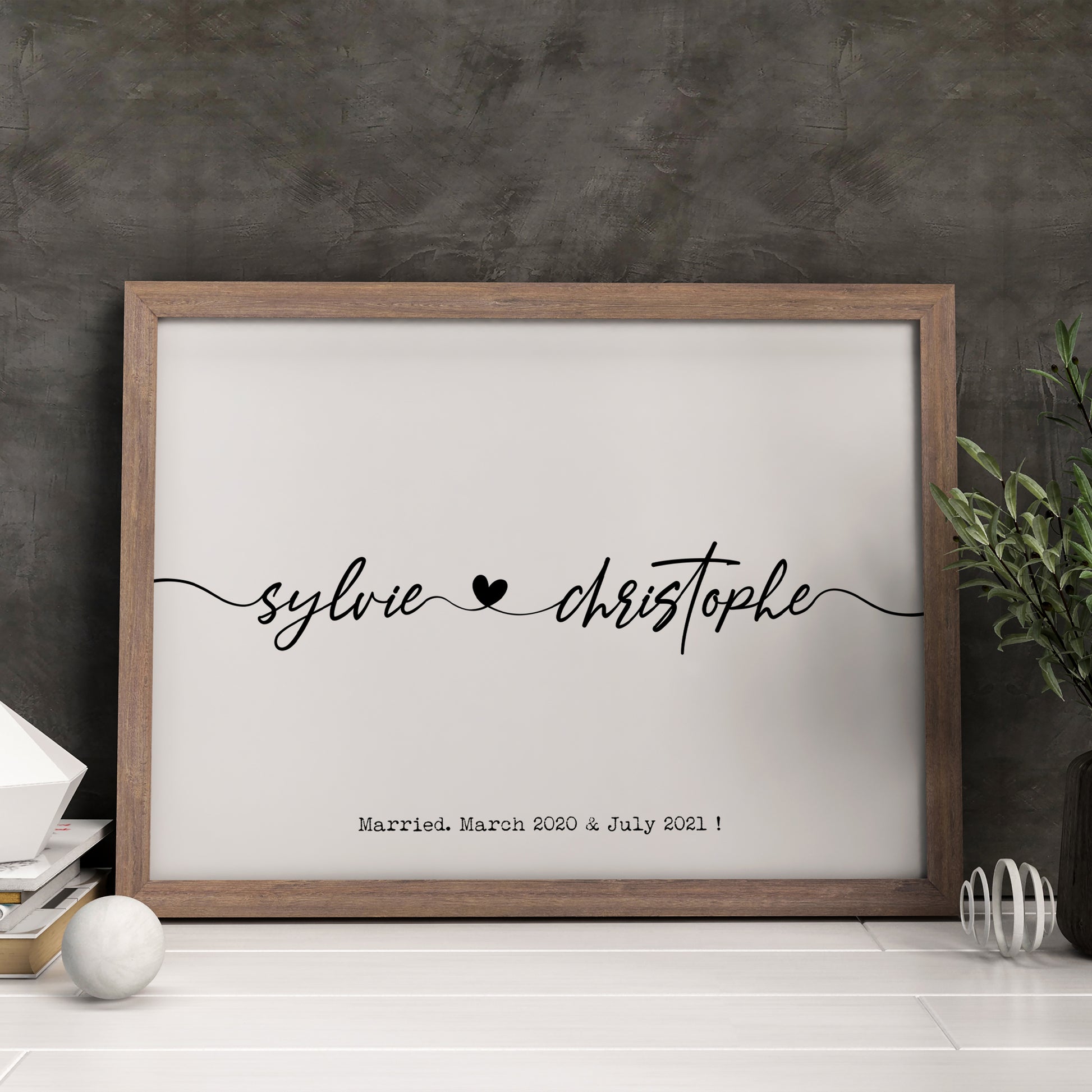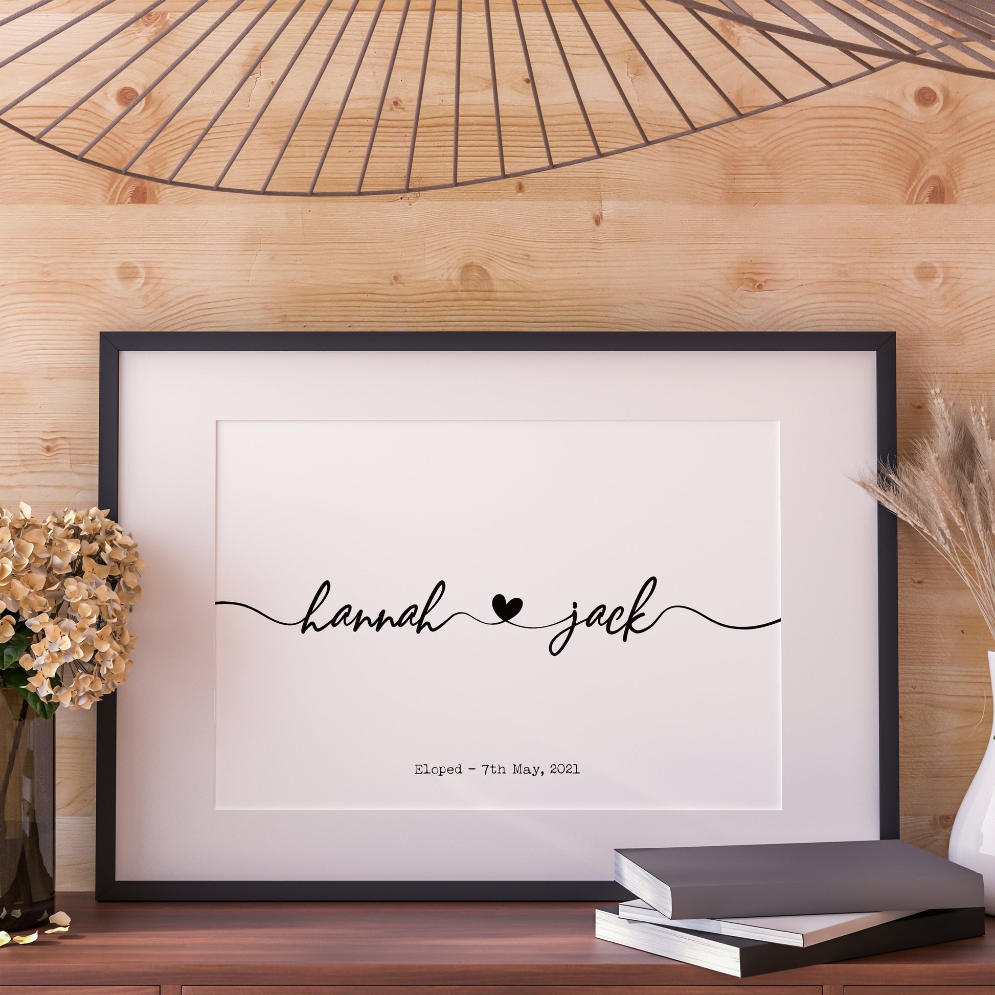 Create a beautiful personalised print for your partner. The design illustrates two names written in an elegant black font joined by a heart in the centre.