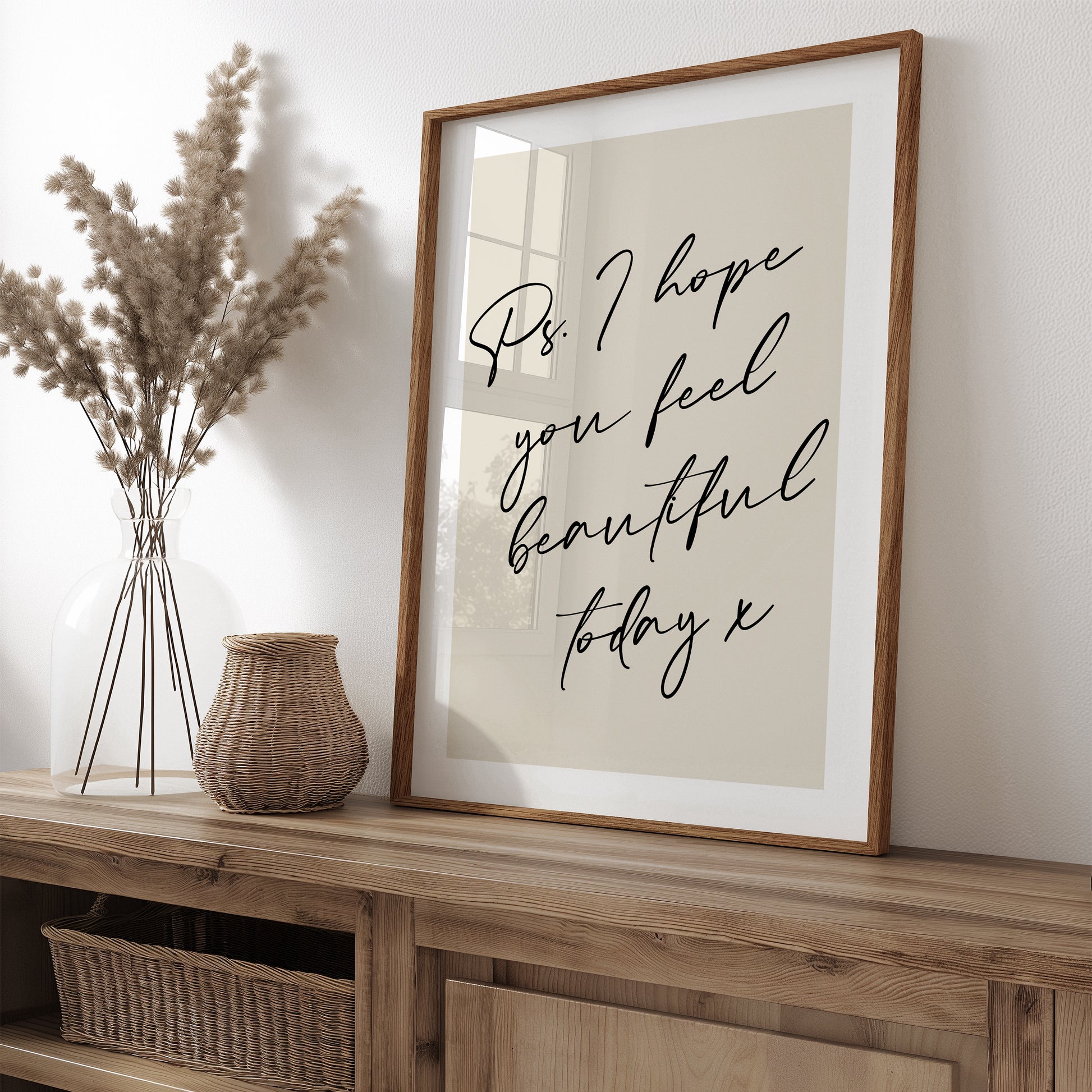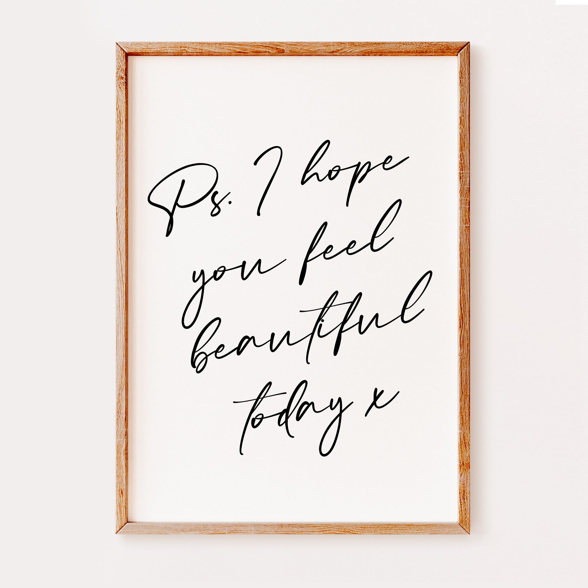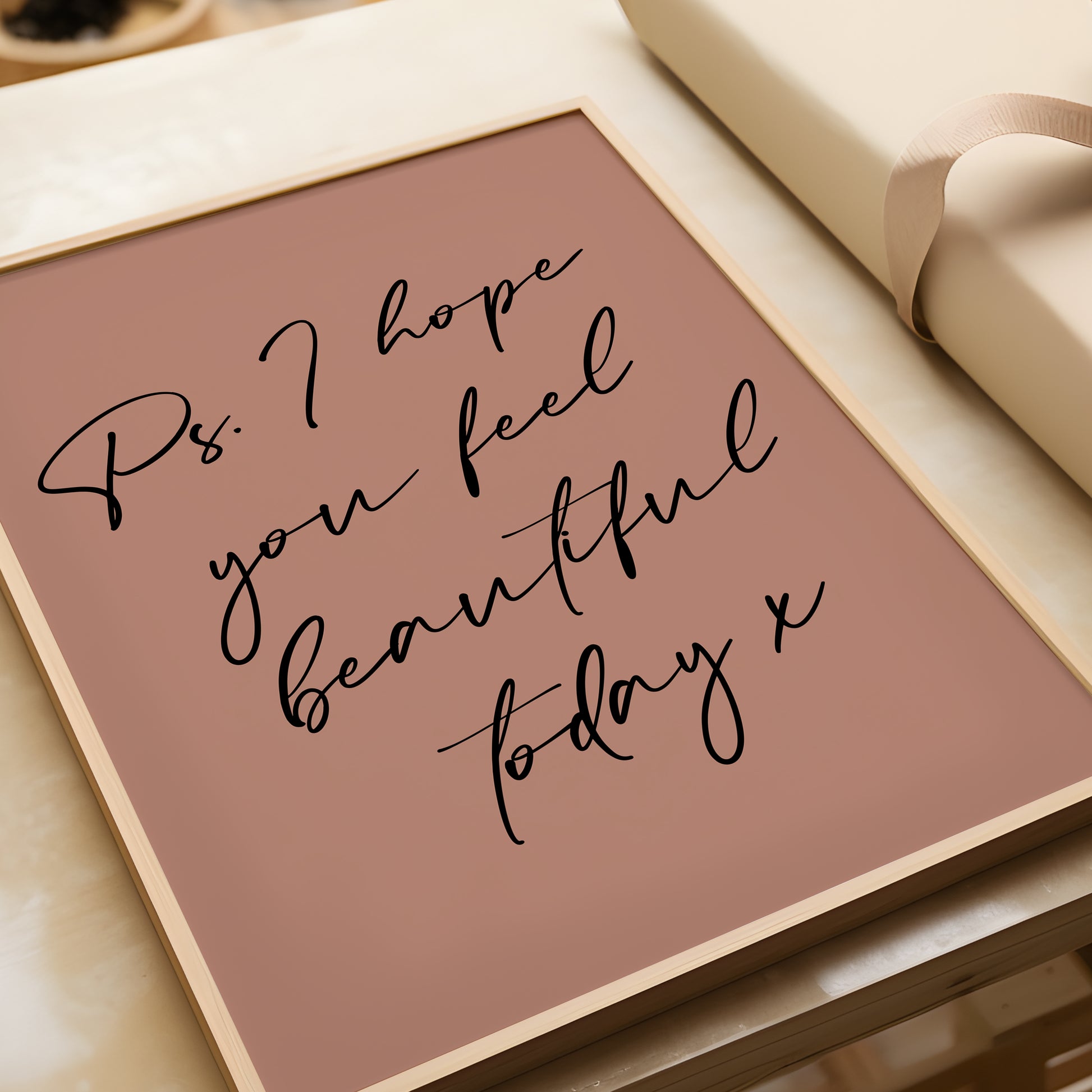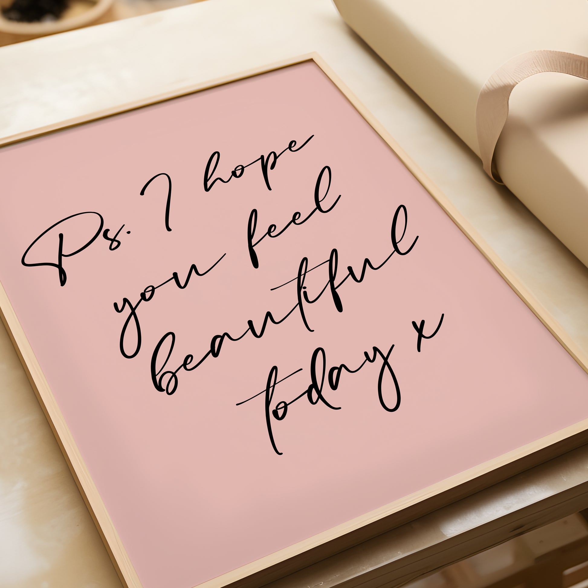 An inspirational art print featuring the quote 'PS I hope you feel beautiful today'. Written in a beautiful script font, this inspiring quote will make you feel loved and motivated to start your day.