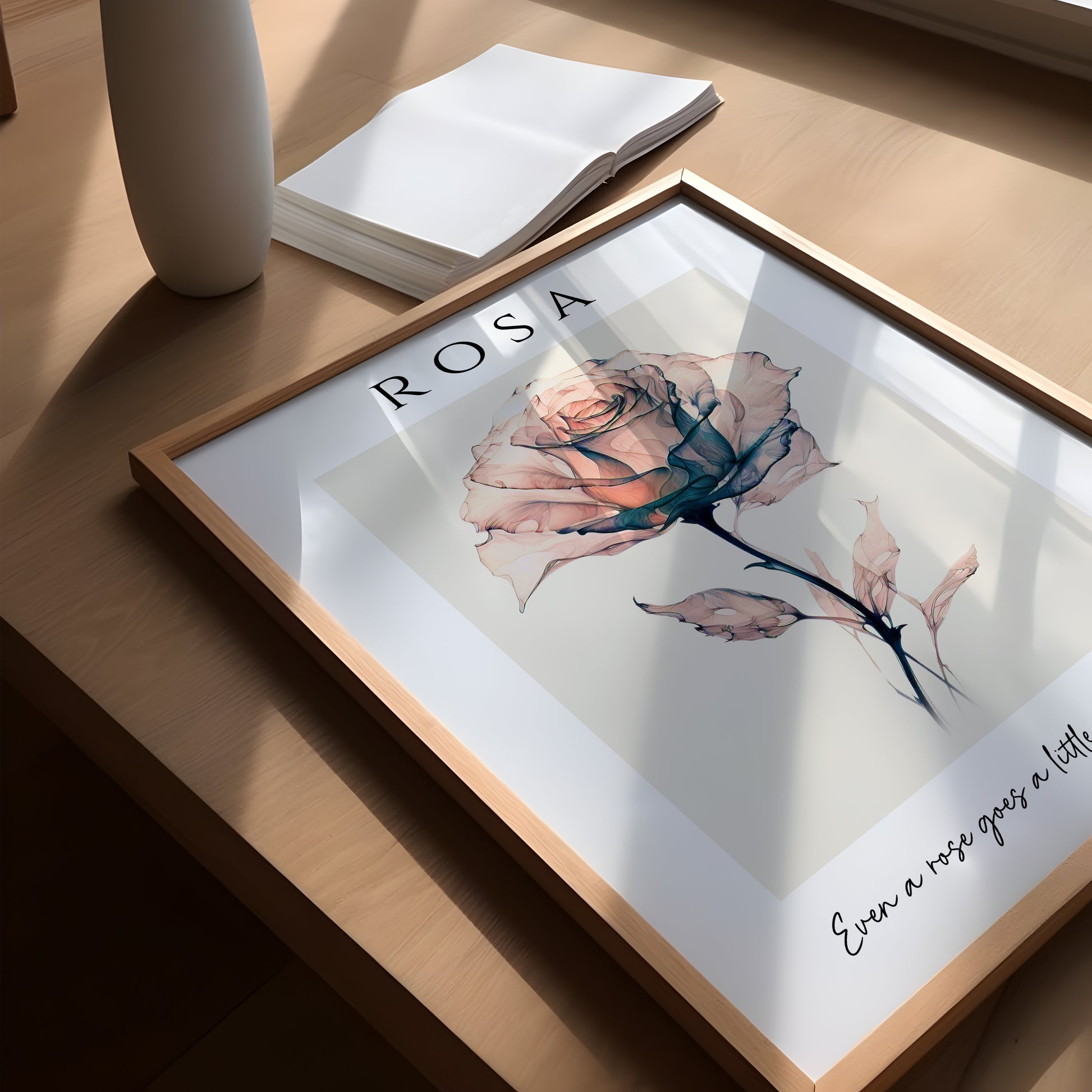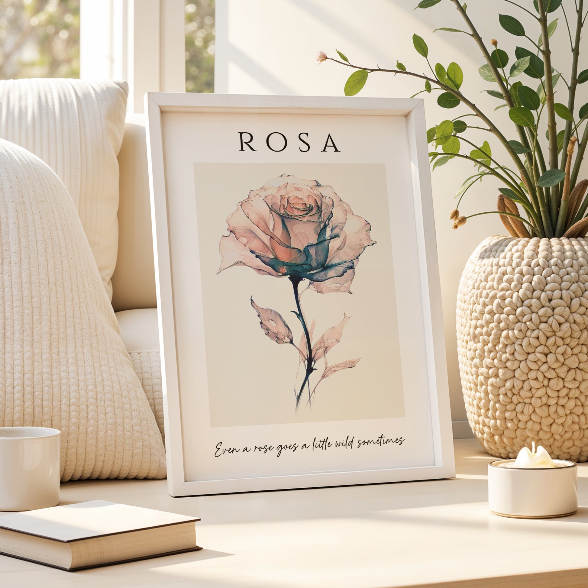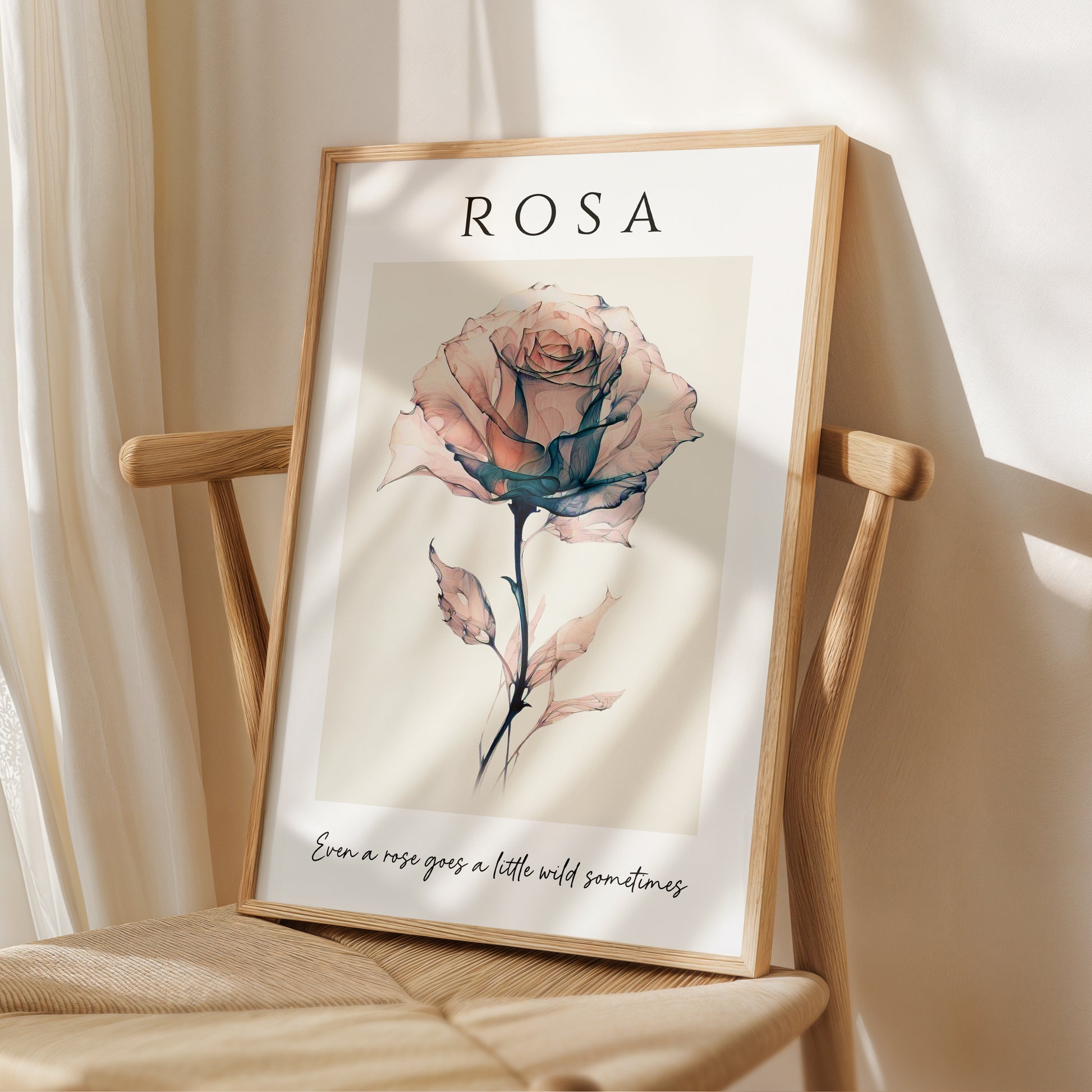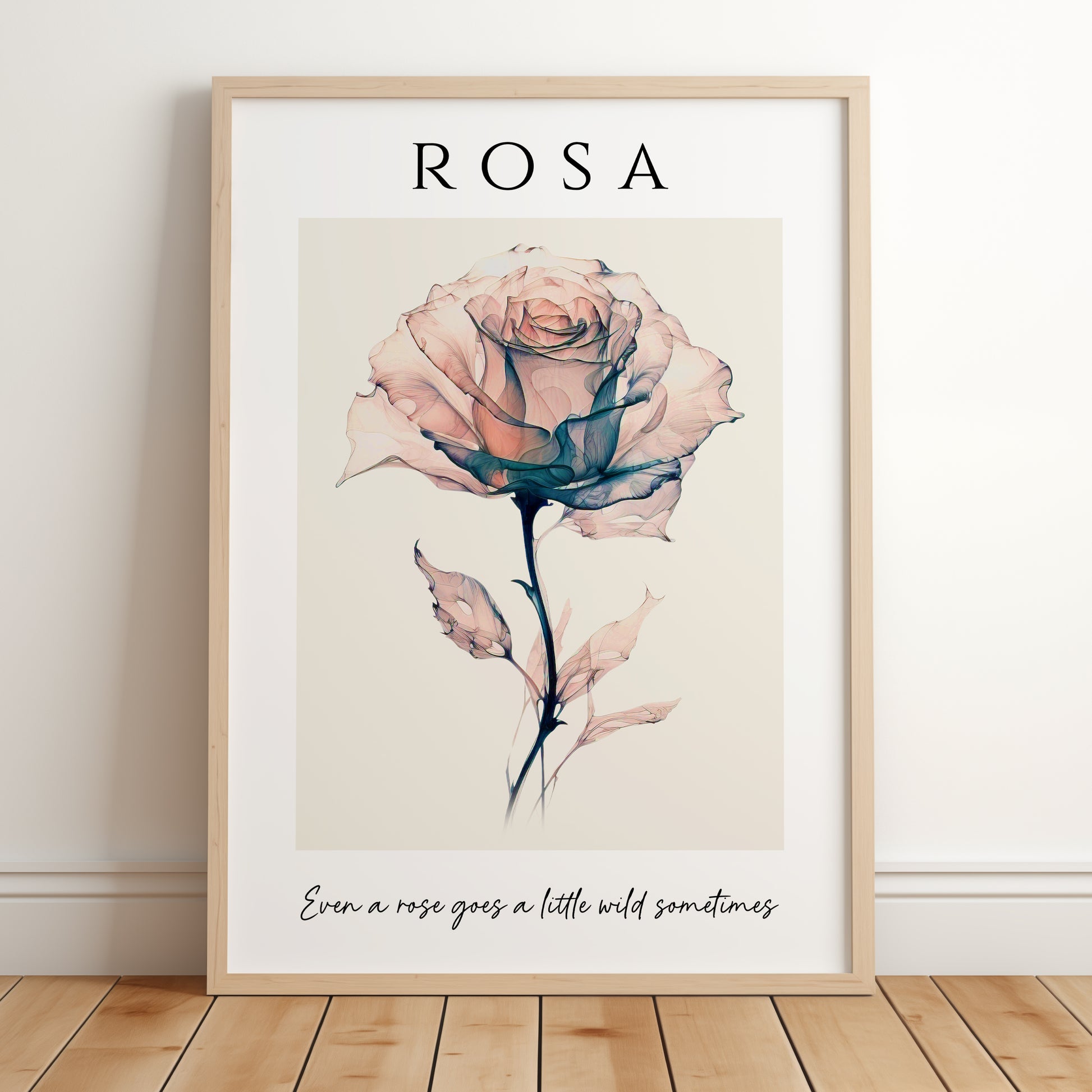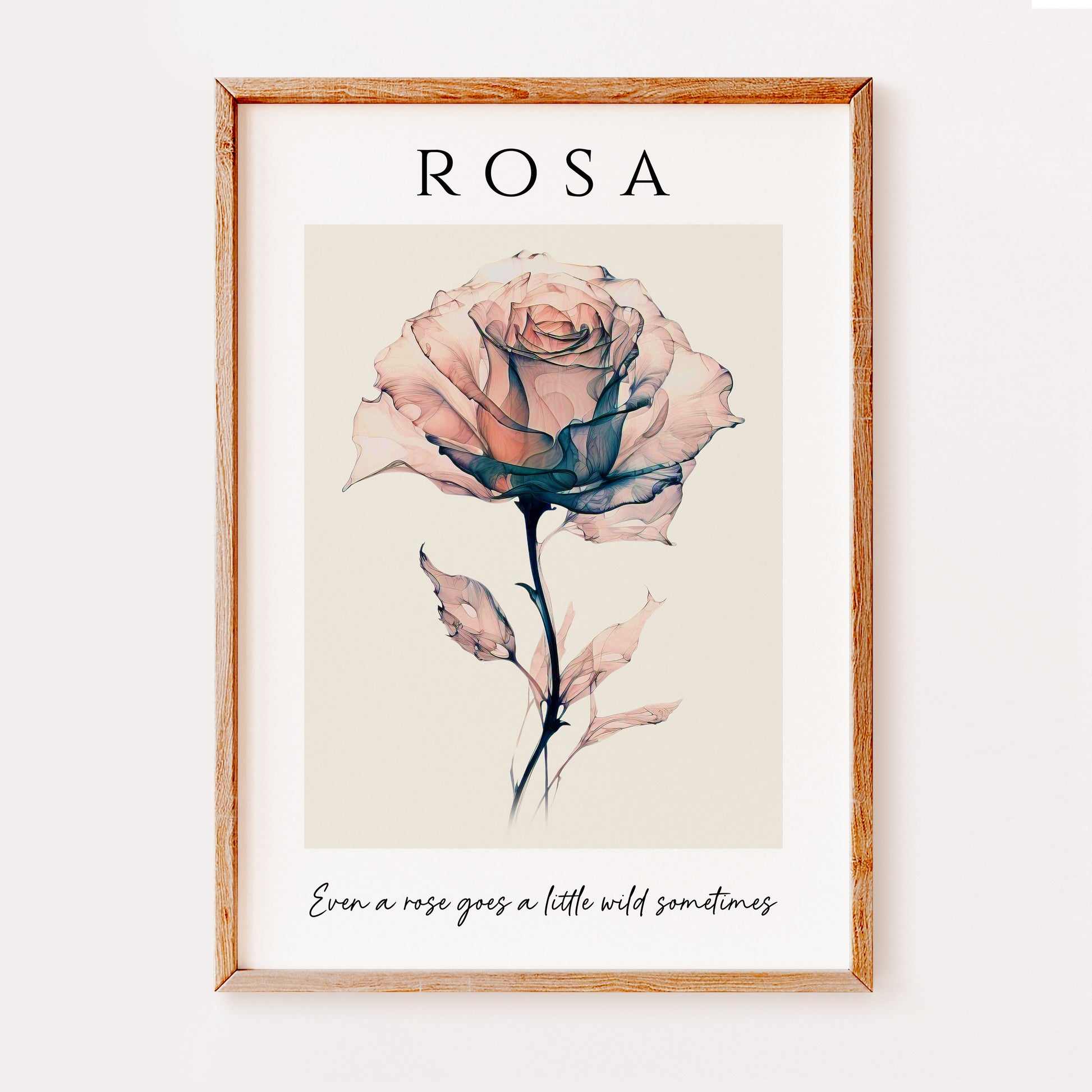 This beautiful artistic illustration features a delicate rose in soft pink and blue colours set on a beige background. The title reads 'Rosa', which is the scientific name for Rose. The quote reads 'Even a rose goes a little wild sometimes' and compliments the design beautifully to make this a wonderful addition to any home decor style.