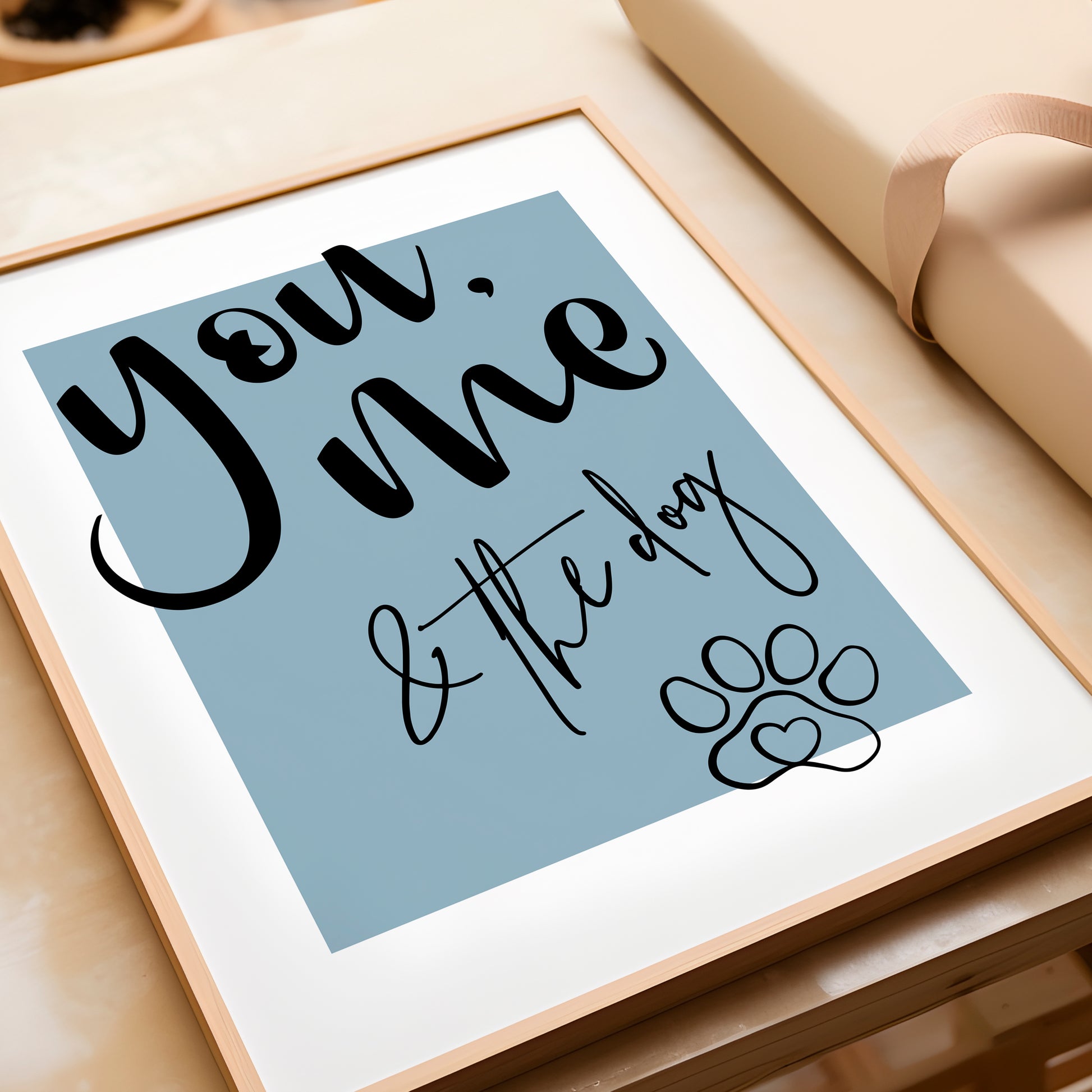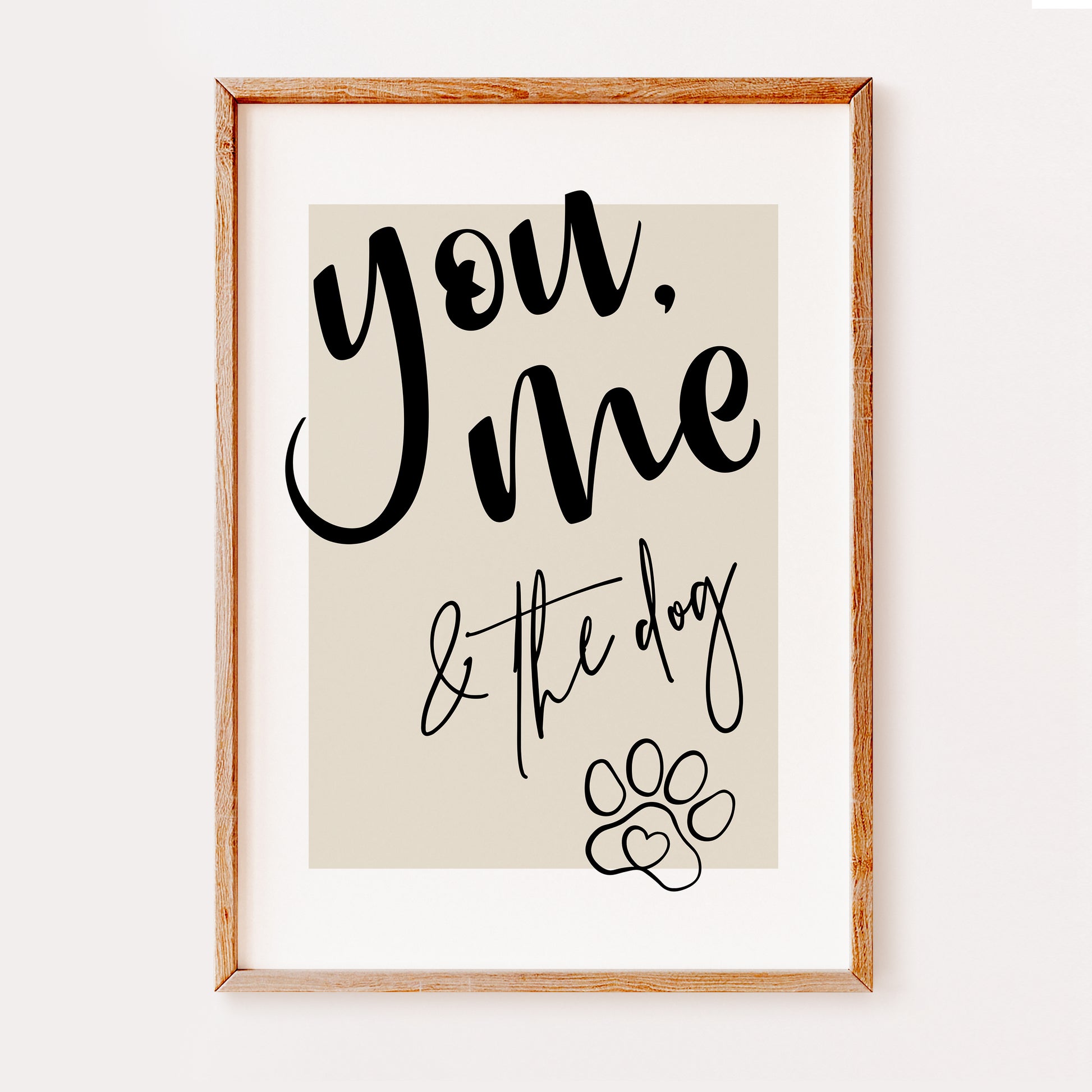 A lovely print created for dog and pet lovers. The design illustrates the words 'You, me & the dog' written in a stylish font with a paw print outline with a small heart inside. The colour options can be customised to suit your interior decor.